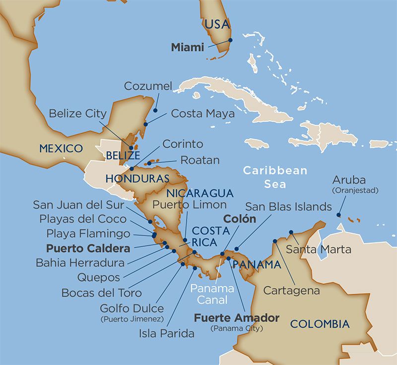 THE RAINFOREST, SEA, AND BEACHES here brim with life — howler monkeys, jaguars, blue morpho butterflies the size of dinner plates — bisected by a canal built on a scale never before attempted by man. Mayan and colonial relics hint at past glories, shrouded in jungle and hidden deep within Belize’s limestone caves. Latin cuisines burst on the palate with the exuberance of a mariachi band. Meet Embera Indians in Panama and search the Costa Rican rainforest for endangered species. You are an explorer by day, with cocktails on the pool deck at 5.